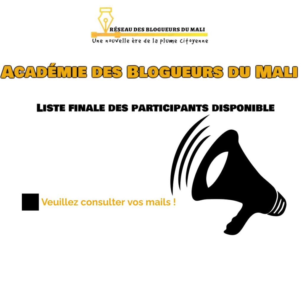 Chers abonné.e.s, nous sommes ravis de vous annoncer que la liste des personnes sélectionnées pour rejoindre l’Académie des Blogueurs du Mali est disponible. Si vous avez soumis votre candidature, veuillez vérifier vos boîtes e-mail pour confirmer votre participation.