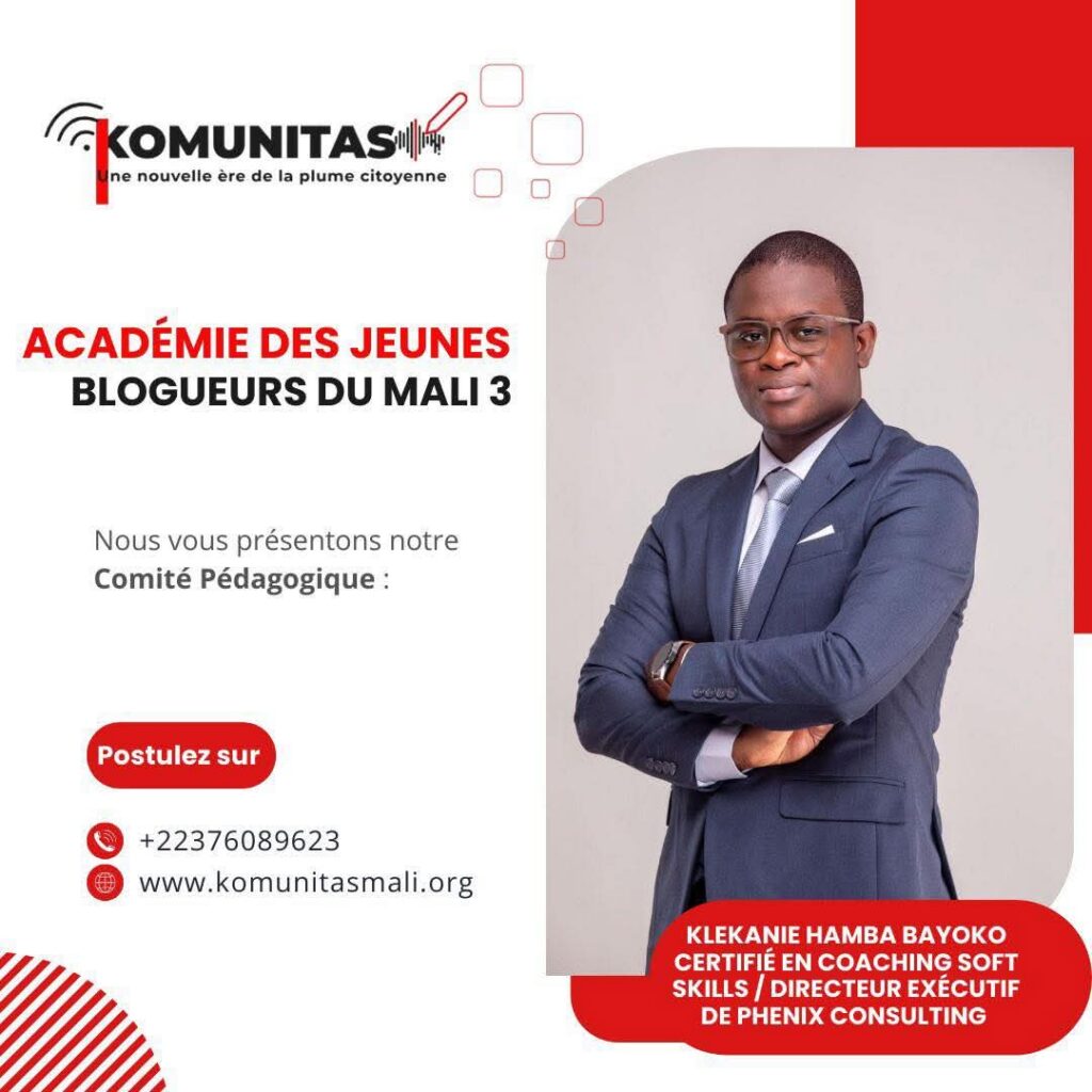 Klékanié Hamba Bayoko , certifié en soft skills et management, est Directeur Exécutif de Phénix Consulting. Membre du comité pédagogique de l’Académie de Leadership du Mali, il conçoit et anime des formations, masterclass et team building pour renforcer la performance.Il représente Initiative LED au sein du comité pédagogique pour la bonne organisation de la 3ᵉ édition de l’Académie des Jeunes Blogueurs du Mali.Pour s’inscrire à cette 3ème édition cliquez sur ce lien 🔗 https://komunitasmali.org/2025/09/17/𝐊𝐨𝐦𝐮𝐧𝐢𝐭𝐚𝐬-𝐋𝐞-𝐑𝐞𝐬𝐞.#appelacandidature#comitepedagogique