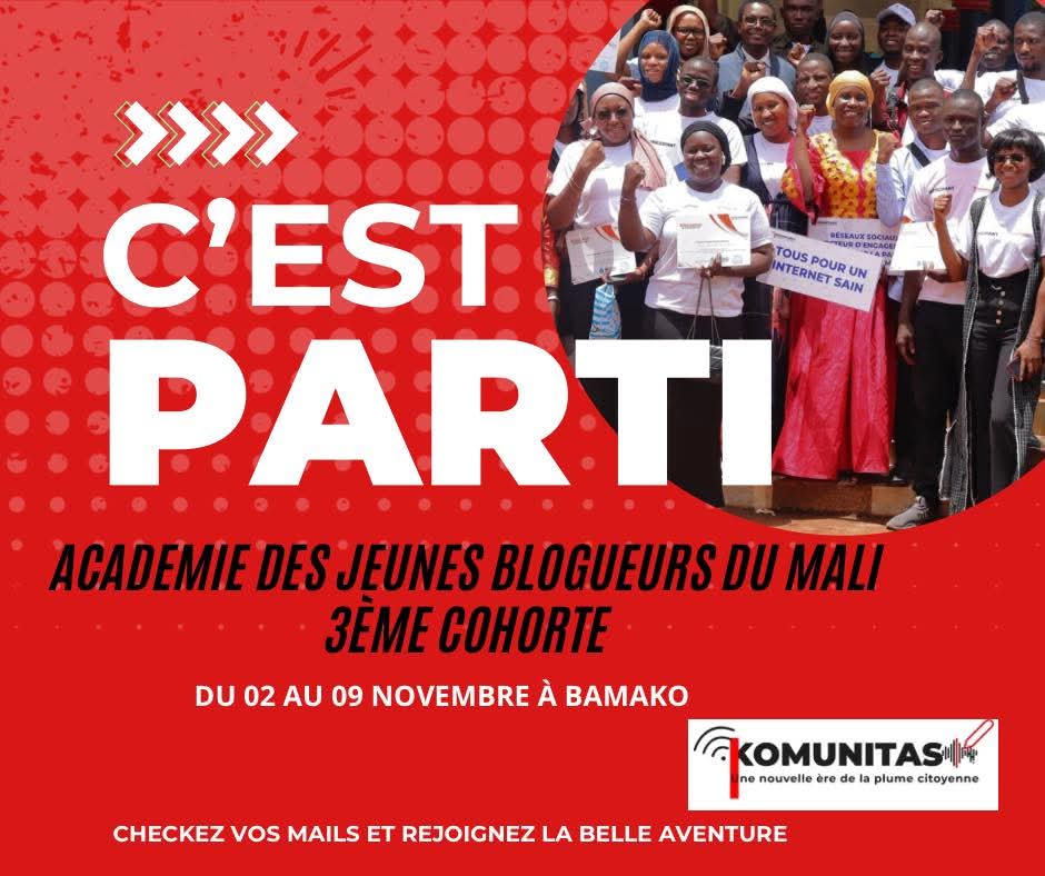Une nouvelle génération de jeunes blogueurs, créateurs de contenu et activistes du numérique vivra l’une des plus grandes expériences de formation au Mali : l’Académie des Jeunes Blogueurs, portée par Komunitas, Le Réseau des Blogueurs du Mali.Pendant une semaine en internat, les participants prendront part à des ateliers pratiques, des conférences thématiques, des sessions de formation, de Grin digital et de team building, animés par des experts du digital, de la communication, de l’information et du plaidoyer.Au programme : création de contenu responsable, lutte contre la désinformation, engagement citoyen en ligne et réalisation d’un projet communautaire.Consultez vos mails et confirmez votre participation 😌📅 Du 02 au 09 Novembre 2025#AJBM3 #KOMUNITAS
