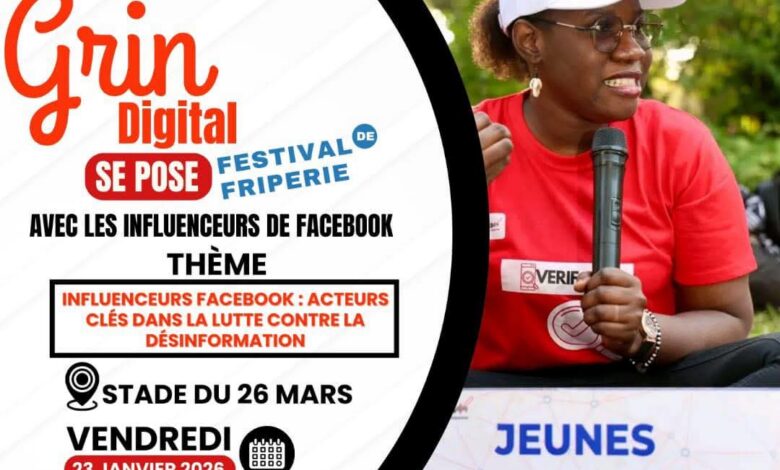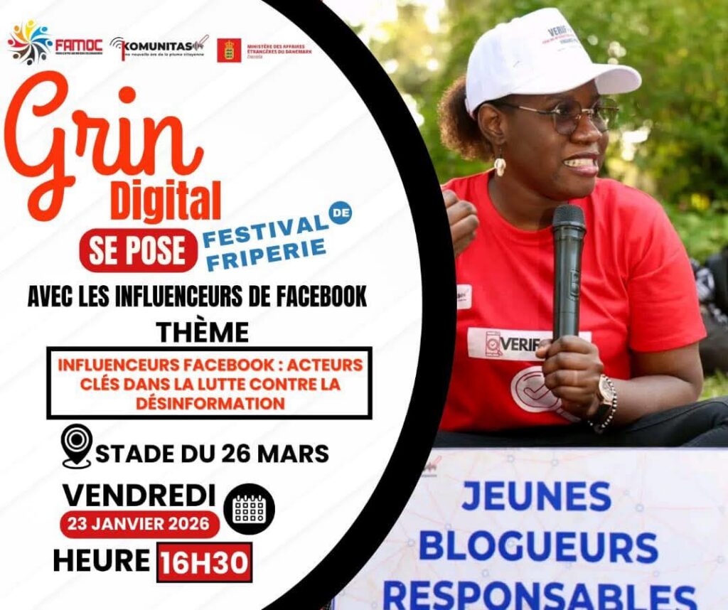 Ce vendredi, le Grin Digital réunit les influenceurs pour parler désinformation au Festival de friperie.📍 Stade du 26 Mars🗓 23 janvier⏰ 16h30Viens t’asseoir au grin avec nous.#VerifAct #CitoyennetéNumérique #JeunesseEngagée #HalteDésinformation #KOMUNITAS