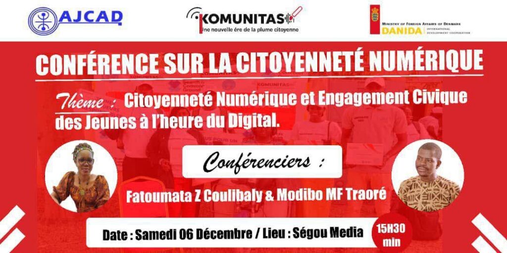 KOMINUTAS Segou, en collaboration avec AJCAD Mali et avec le soutien de #DANIDA, vous invite à une conférence exceptionnelle autour du thème :🔥 « Citoyenneté Numérique et Engagement Civique des Jeunes à l’Heure du Digital »🎤 Conférenciers : • Fatoumata Z Coulibaly, Enseignante chercheuse à l’université de Ségou. • Modibo MF Traoré, Président du CCJ Ségou.Une occasion unique pour les jeunes de comprendre les enjeux du digital, de renforcer leur engagement citoyen et d’apprendre à agir de manière responsable dans l’espace numérique.📅 Date : Samedi 06 décembre📍 Lieu : SEGOU MEDIA !!!🕒 Heure : 15h30👉 Jeunes de Ségou et d’ailleurs, ne manquez pas ce rendez-vous !Ensemble, construisons une citoyenneté numérique active, responsable et engagée. 💡🇲🇱