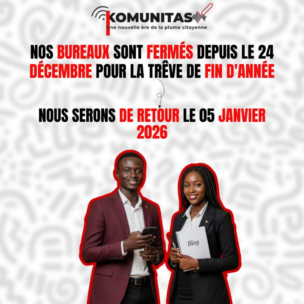 Bonjour chère communauté Nous vous informons que les bureaux de Komunitas seront fermés du 24 décembre 2025 au 5 janvier 2026.Cette pause marque une trêve de fin d’anné, pour se ressourcer, faire le bilan de 2025 et préparer 2026 avec encore plus d’énergie.Pendant cette période, vous pouvez toujours nous joindre par :📧 E-mail : infos@komunitasmali.org📞 Téléphone : 76 23 08 84 86Merci pour l’énergie partagée tout au long de l’année 2025, pour votre soutien continu et pour l’affection que vous portez à Komunitas. On se retrouve très vite pour encore plus d’actions, de voix citoyennes et d’impact.Komunitas, une nouvelle ère de la plume citoyenne ! ✍️✨#Komunitas #CitoyennetéNumérique #InformationResponsable #Mali