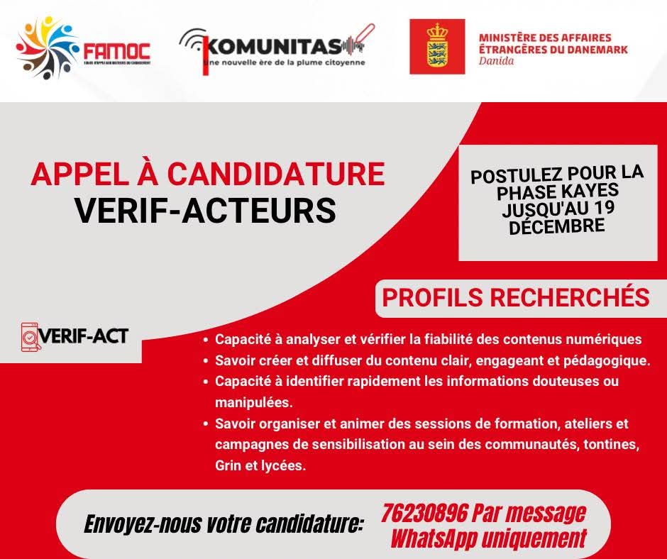 Vous aimez analyser, comprendre et protéger votre communauté contre la désinformation ? C’est le moment de nous rejoindre Chez KOMUNITAS, nous avons décidé de ne pas rester spectateurs.Devenez VERIF-Acteurs pour former, sensibiliser et outiller les jeunes à faire du numérique un espace plus sûr, plus fiable et plus citoyen avec l’appui financier du Ministère des Affaires Étrangères du Danemark (DANIDA) à travers le FAMOC.📅 Date limite : 19 Décembre 🔍 Compétences recherchées :✔️Résider à KAYES✔️ Analyse et vérification de la fiabilité des contenus numériques✔️ Création et diffusion de contenus clairs, engageants et pédagogiques✔️ Capacité à repérer rapidement les informations douteuses ou manipulées✔️ Maitrise de l’animation de formations, ateliers et campagnes de sensibilisation (communautés, tontines, écoles, lycées…)📣 Vous pensez avoir le bon profil ?Vous souhaitez contribuer à un Mali mieux informé et plus résilient face aux intox ?📩 Envoyez votre candidature composée d’une lettre de motivation et des liens de vos réseaux sociaux ainsi que votre preuve d’animation d’au moins 3 seances de formation 76230896 uniquement par message WhatsApp.Ensemble, faisons de l’information un outil de paix, pas une arme de confusion. 🇲🇱✨