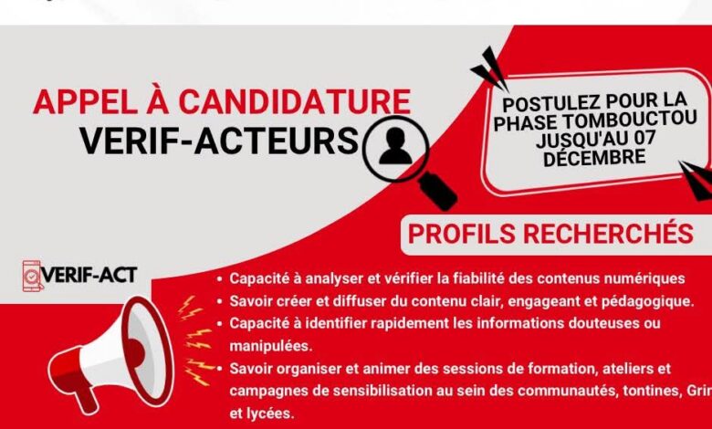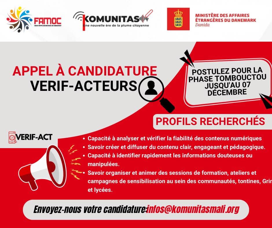 Après Bamako, Komunitas dépose ses valises à Tombouctou. Aujourd’hui plus que jamais, la désinformation circule vite. Très vite. Et ses conséquences sont bien réelles : conflits, méfiance, manipulation, divisions…Chez KOMUNITAS, nous avons décidé de ne pas rester spectateurs.Devenez VERIF-Acteurs pour former, sensibiliser et outiller les jeunes à faire du numérique un espace plus sûr, plus fiable et plus citoyen avec l’appui financier du Ministère des Affaires Étrangères du Danemark (DANIDA) à travers le FAMOC.📅 Date limite : 07 Décembre 🔍 Compétences recherchées :✔️Habiter à Tombouctou ✔️ Analyse et vérification de la fiabilité des contenus numériques✔️ Création et diffusion de contenus clairs, engageants et pédagogiques✔️ Capacité à repérer rapidement les informations douteuses ou manipulées✔️ Maitrise de l’animation de formations, ateliers et campagnes de sensibilisation (communautés, tontines, écoles, lycées…)📣 Vous pensez avoir le bon profil ?Vous souhaitez contribuer à un Mali mieux informé et plus résilient face aux intox ?📩 Envoyez votre candidature composée d’une lettre de motivation et des liens de vos réseaux sociaux ainsi que votre preuve d’animation d’au moins 3 seances de formation à : infos@komunitasmali.orgEnsemble, faisons de l’information un outil de paix, pas une arme de confusion. 🇲🇱✨