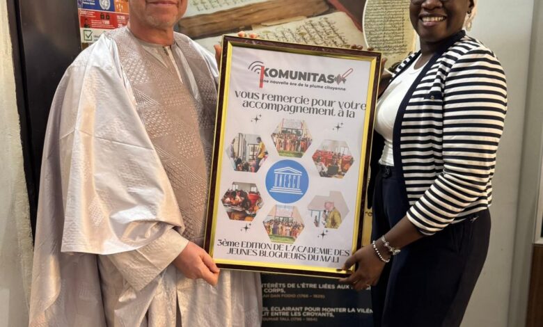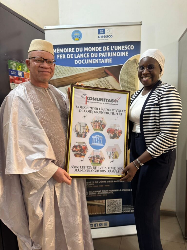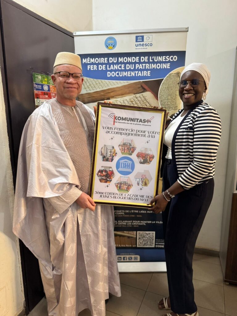 KOMUNITAS a procédé à la remise d’une attestation de reconnaissance à UNESCO, en signe de gratitude pour son accompagnement et son appui constant à la 3ᵉ édition de l’Académie des Jeunes Blogueurs du Mali.À travers cet engagement, l’UNESCO a contribué de manière significative au renforcement des capacités des jeunes, à la promotion d’un usage responsable du numérique, ainsi qu’à la valorisation de la citoyenneté numérique, de l’éducation aux médias et de la culture de paix.KOMUNITAS renouvelle ses remerciements à l’UNESCO pour sa confiance et son engagement durable en faveur de la jeunesse et du développement du numérique citoyen au Mali.🙏🏾#KOMUNITAS #UNESCO #AcadémieDesJeunesBlogueurs #Jeunesse #ÉducationAuxMédias #NumériqueResponsable #Partenariat